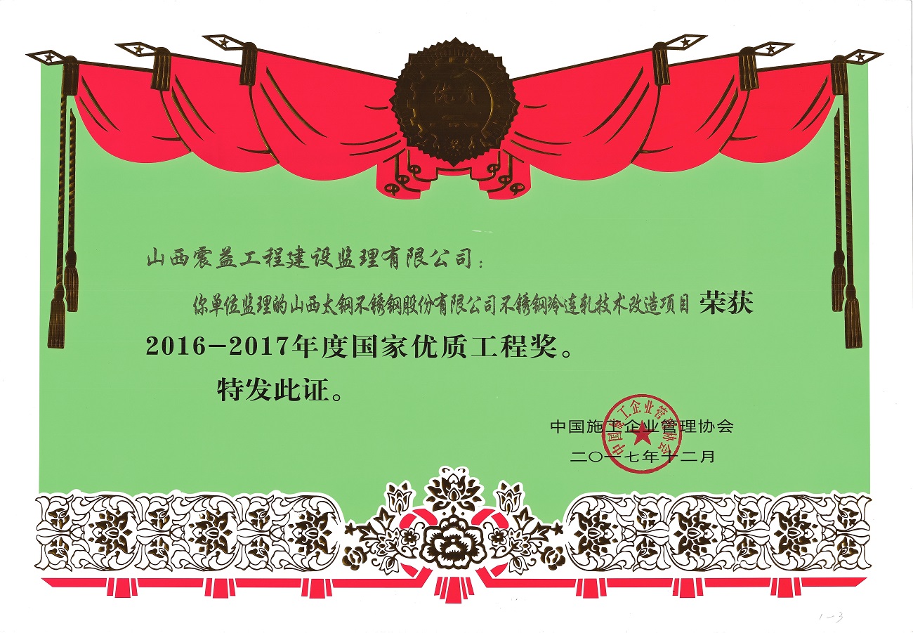 公司先后承擔(dān)了冶金、機(jī)械、電力、礦山、市政、環(huán)保、房屋建筑等工業(yè)及民用建設(shè)大中型工程項(xiàng)目1000余個,足跡遍及國內(nèi)二十多個省市,在全國各地四千余個制造廠家進(jìn)行了駐廠設(shè)備監(jiān)理,工程監(jiān)理也立足省內(nèi)輻射全國多個省區(qū)乃至國外。多年來,我們憑著嚴(yán)格監(jiān)理、優(yōu)質(zhì)服務(wù)的工作作風(fēng)贏得業(yè)主的信任和好評,受監(jiān)工程質(zhì)量合格率均為100%。由我公司監(jiān)理的太鋼7.63m焦?fàn)t(及配套化產(chǎn))工程、450㎡燒結(jié)工程、4350m3高爐工程、400萬噸煉鋼/連鑄工程、2250mm熱軋工程、新不銹鋼冷軋工程、熱軋加熱爐工程、冶煉廢水處理工程、BOC制氧工程、40萬噸及50萬噸不銹鋼冷軋工程、制鐵煉鋼節(jié)能減排660㎡燒結(jié)機(jī)工程、不銹鋼冷軋光亮板結(jié)構(gòu)調(diào)整工程、型材系統(tǒng)改造一期徑鍛機(jī)工程、加工廠礦渣超細(xì)粉二期工程、2250mm熱連軋罩式爐工程、2250mm熱連軋新建鋼卷表面處理線工程、袁家村鐵礦項(xiàng)目、不銹冷連軋技術(shù)改造工程、硅鋼冷連軋技術(shù)改造工程等等多項(xiàng)工程項(xiàng)目均獲得了“冶金工業(yè)優(yōu)質(zhì)工程”獎;日貸清潔生產(chǎn)90噸電爐工程獲山西省“汾水杯”質(zhì)量獎;太原濱河小區(qū)、19宿舍、太鋼2*300MW自備電廠、太原市不銹鋼工業(yè)園區(qū)等工程獲太原市“******文明施工樣板”工地;太鋼不銹2*300MW自備電廠改擴(kuò)建煙筒構(gòu)筑物工程、太鋼2*300MW空冷供熱機(jī)組儲煤筒倉建筑工程、山西太鋼不銹鋼科技冷軋精密帶鋼工程等獲“山西省優(yōu)良工程”;1350 m3高爐、400萬噸煉鋼/連鑄工程獲得******建設(shè)工程“魯班”獎、不銹冷連軋技術(shù)改造工程獲“******優(yōu)質(zhì)工程獎”。太鋼150萬噸不銹鋼系統(tǒng)工程同時獲******“建國60年來經(jīng)典暨精品工程”獎、“******優(yōu)質(zhì)工程金質(zhì)獎”、******工程建設(shè)“魯班”獎三項(xiàng)大獎。